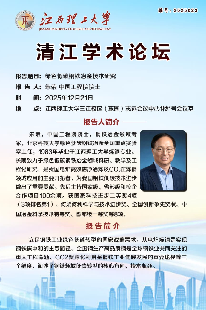 朱荣,中国工程院院士,钢铁冶金领域专家,北京科技大学绿色低碳钢铁冶金全国重点实验室主任,1983年毕业于江西理工大学炼钢专业。长期致力于绿色低碳钢铁冶金领域科研、教学及工程化研究,是我国电炉高效洁净冶炼及CO2在炼钢领域应用的主要开拓者,为我国钢铁低碳技术进步做出了重要贡献。先后主持国家级、省部级和校企合作项目100余项。获国家科技进步二等奖4项(3项排名第1)、何梁何利科学与技术进步奖、全国创新争先奖状、中国冶金科学技术特等奖、省部级一等奖等8项。