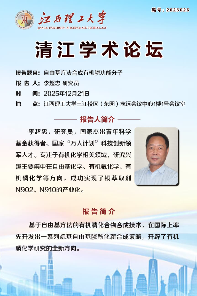 李超忠,研究员,国家杰出青年科学基金获得者、国家“万人计划”科技创新领军人才。专注于有机化学相关领域,研究兴趣主要集中在自由基化学、有机氟化学、有机磷化学等方向,成功实现了铜萃取剂N902、N910的产业化。