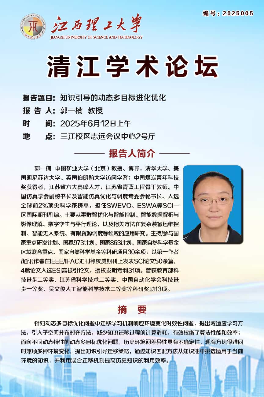清江学术论坛 报告题目:知识引导的动态多目标进化优化 报告人:郭一楠 教授 时间:2025年6月12日上午 地点:三江校区志远会议中心2号厅 报告人简介: 郭一楠,中国矿业大学(北京)教授、博导,清华大学、美国明尼苏达大学、英国伯明翰大学访问学者;中国煤炭青年科技奖获得者,江苏省六大高峰人才,江苏省青蓝工程骨干教师。中国仿真学会副秘书长及智能仿真优化与调度专委会秘书长、入选全球前2%顶尖科学家榜单,担任SWEVO、ESWA等SCI一区国际期刊副编。主要从事群智优化与智能控制、智能数据解析与影像理解、数字孪生与平行理论,以及相关方法在复杂装备运维控制、智能无人系统、有限资源调度等领域的应用研究。主持/参与国家重点研发计划、国家973计划、国家863计划、国家自然科学基金区域联合重点、国家自然科学基金等科研项目30余项;以第一作者/通讯作者在IEEE/IFAC汇刊等权威期刊上发表SCI论文50余篇,4篇论文人选ESI高被引论文,授权发明专利31项。曾获教育部科技进步二等奖、江苏省科学技术二等奖、中国自动化学会科技进步一等奖、吴文俊人工智能科学技术二等奖等科研奖励13项。 摘要: 针对动态多目标优化问题中迁移学习机制响应环境变化时效性问题,提出域适应学习方法,引入子空间分布对齐方法,减少知识迁移过程的计算消耗,有效权衡了算法性能和效率;面向不同动态特性的动态多目标优化问题,历史环境间差异性具有不确定性,现有方法很难同时兼顾多种环境变化,提出知识引导迁移策略,通过知识匹配方法从知识池中挑选适用于当前环境的知识,并利用混合迁移机制提高历史知识的利用效率。